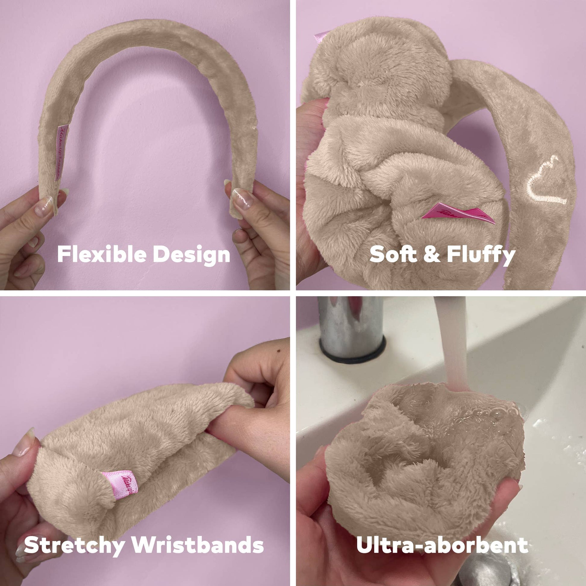 Wristbands are ultra-absorbent & designed to stop the flow of water down your arms as you do your AM/PM skincare routine. No more wet counters, no more wet sleeves! Fluffy headband keeps hair pulled back & out of your face