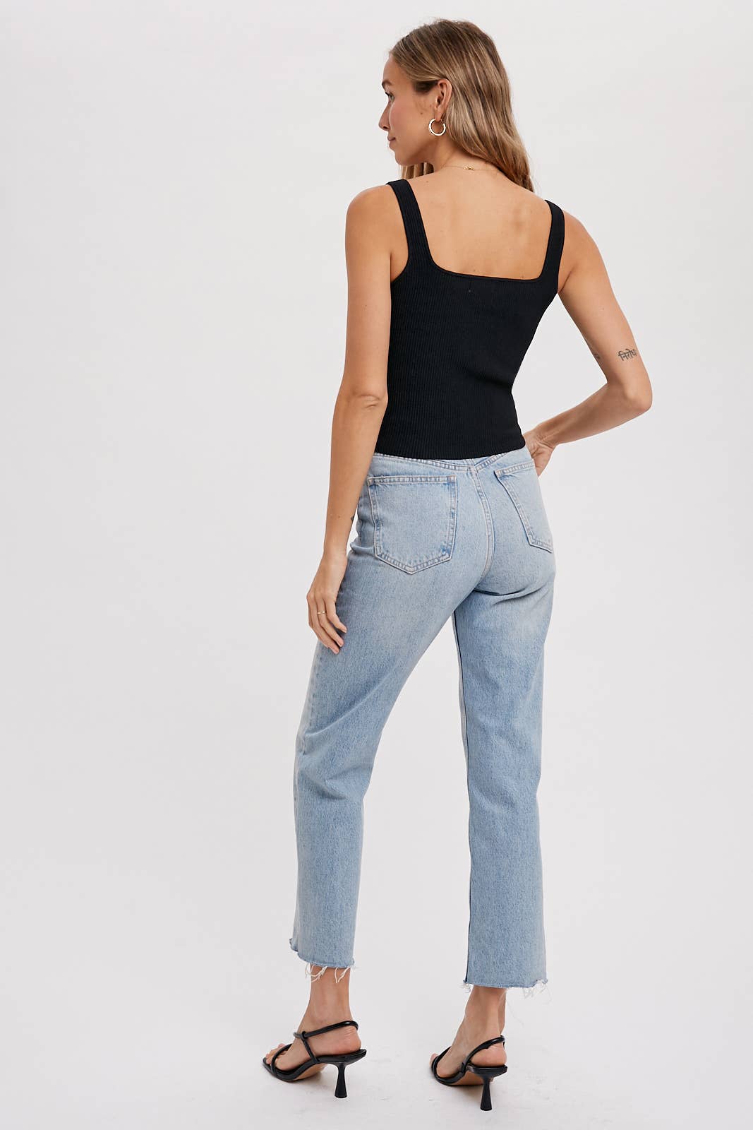Basic essential tank featuring a ribbed stretch yarn, sweatheart neckline, structured and textural feel, fitted silhouette.