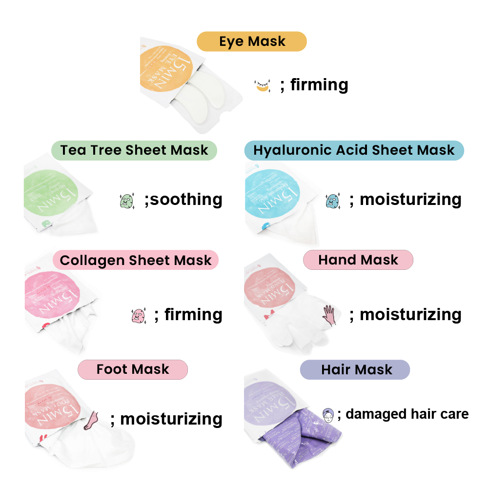 * 15 MIN FACE MASKS (X3)-Collagen Facial Sheet Mask, Tea Tree Facial Sheet Mask, and Hyaluronic Acid Facial Sheet Mask, can give you a pleasant spa experience at home, and soothing, moisturizing while giving firming, effects.