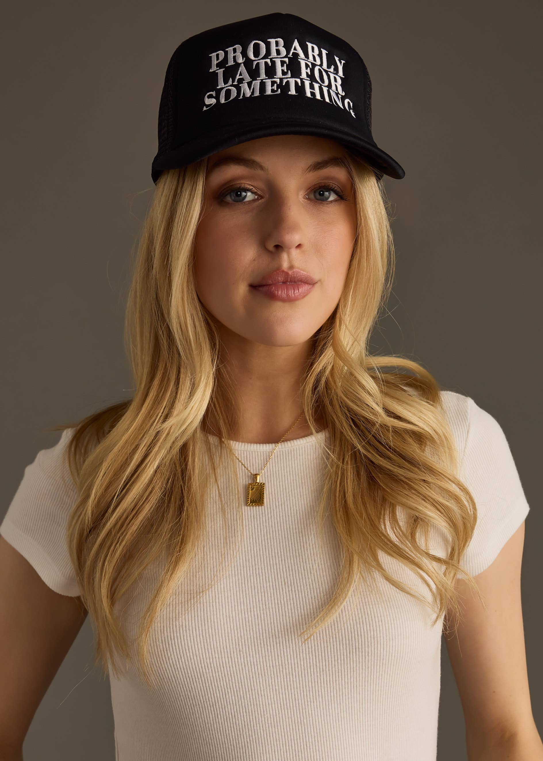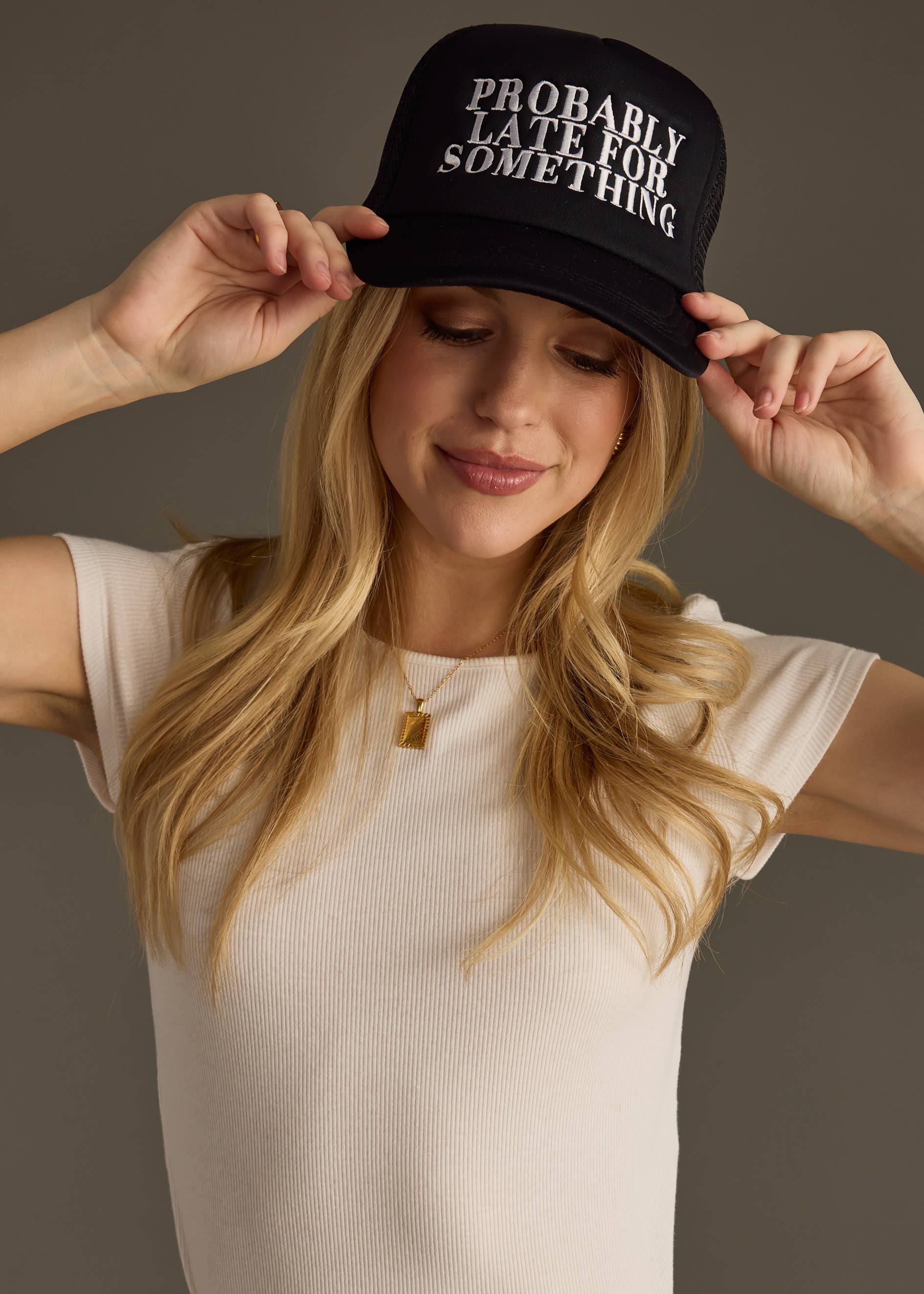 Black trucker hat White embroidered "Probably late for something" 100% Polyester Adjustable snapback closure